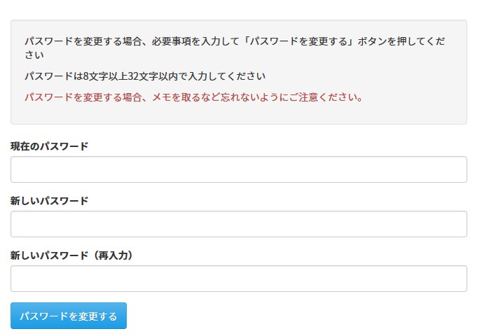 現在のパスワードと新しいパスワード(2回)を入力することで、パスワードの変更が可能です。