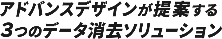最適なデータ消去⽅法は⽬的や状況によって⽅法も様々です。アドバンスデザインではお客様のデータ保有状況や消去の⽬的等をお伺いして「機器の購⼊」から「機器のレンタル」、「消去サービス利⽤」まで、確実にお客様の⽬的やご要望にお応えできるよう専⾨のスタッフが最適なデータ消去⽅法をご提案します。⽬的や状況によって組み合わせが様々ございます。