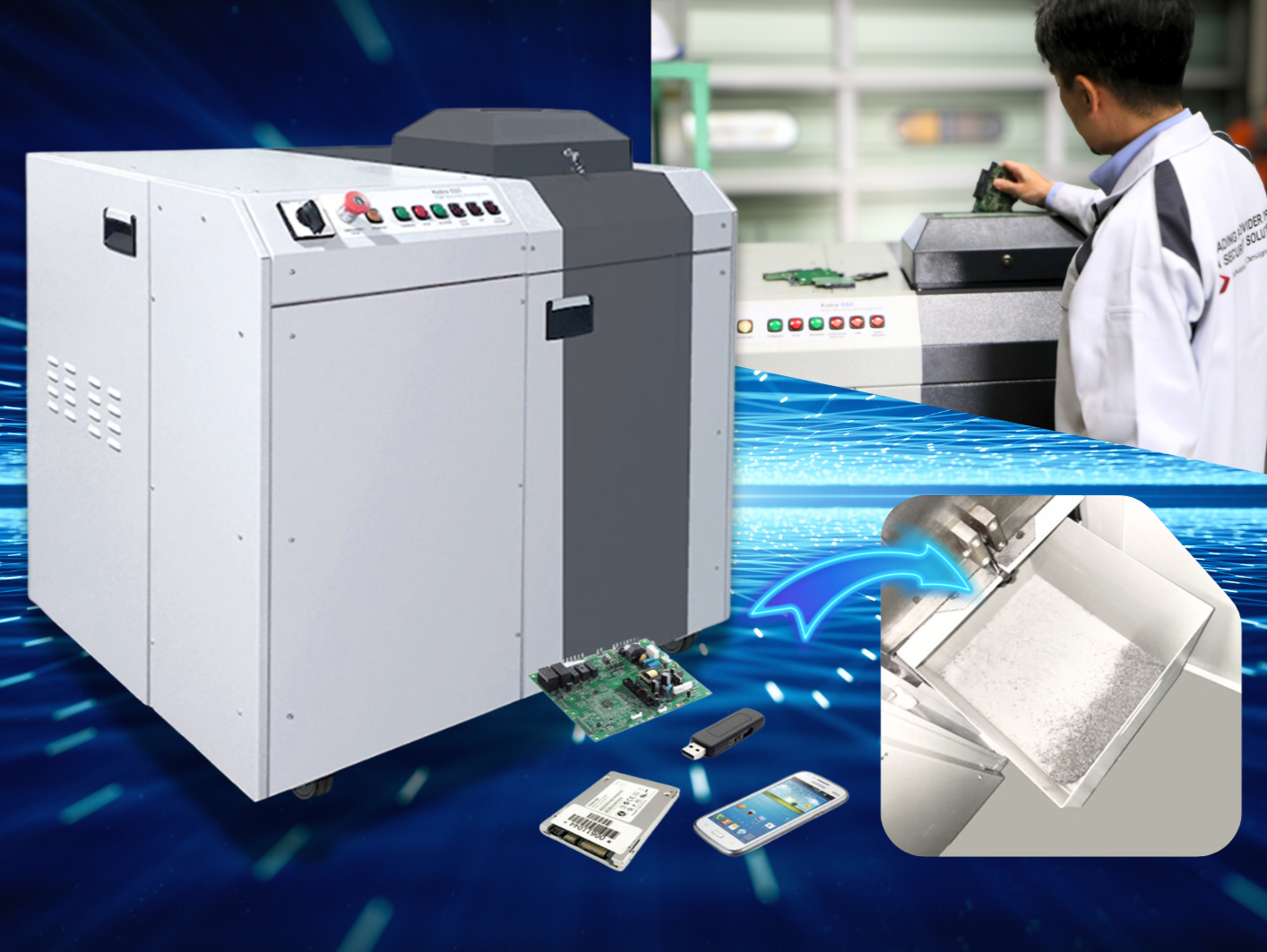 物理破壊装置等の専用機器により、簡単かつ安全、スピーディに記憶メディアへの適切な破壊が実現します。目視での安心には物理破壊が適しています。